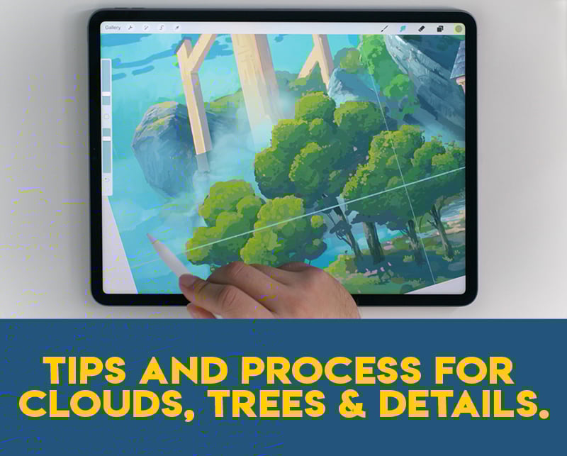 Access to four hours of fully narrated painting videos. You'll learn how this complex illustration was made. How to paint clouds and trees in landscapes without any preliminary line art. All of the tips and tricks revealed in how this painting was created. Tips on how to paint textures and how to study painting. Includes downloadable brush and colour palette used in this painting. Unedited footage of the whole process from start to finish.
