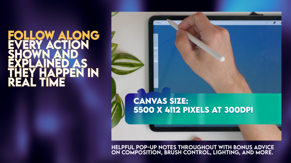 Helpful pop-up notes throughout the series with bonus advice on composition, brush control, lighting, and more. - 🖌️ Custom Brushes, Palette used and a bonus brush so you can use all the same tools used in this project