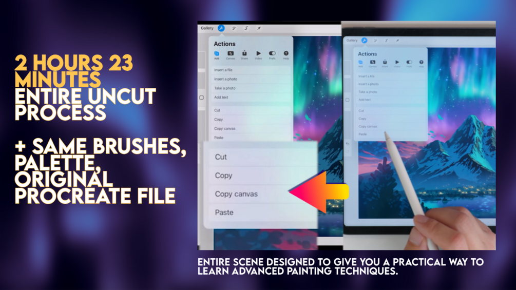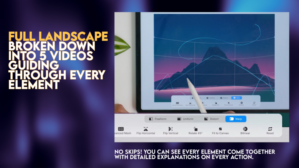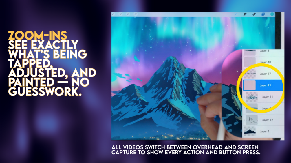 You’ll see every stroke, every layer created, every Procreate setting, and every artistic decision, with supporting tips and commentary all the way through. I wanted this to feel like I’m painting right beside you. I've been doing concept art and teaching art for years and I wanted to design a landscape that would allow me to show how technical aspects of a scene like this are done in practice while also teaching the underlying art techniques that help in all kinds of paintings.